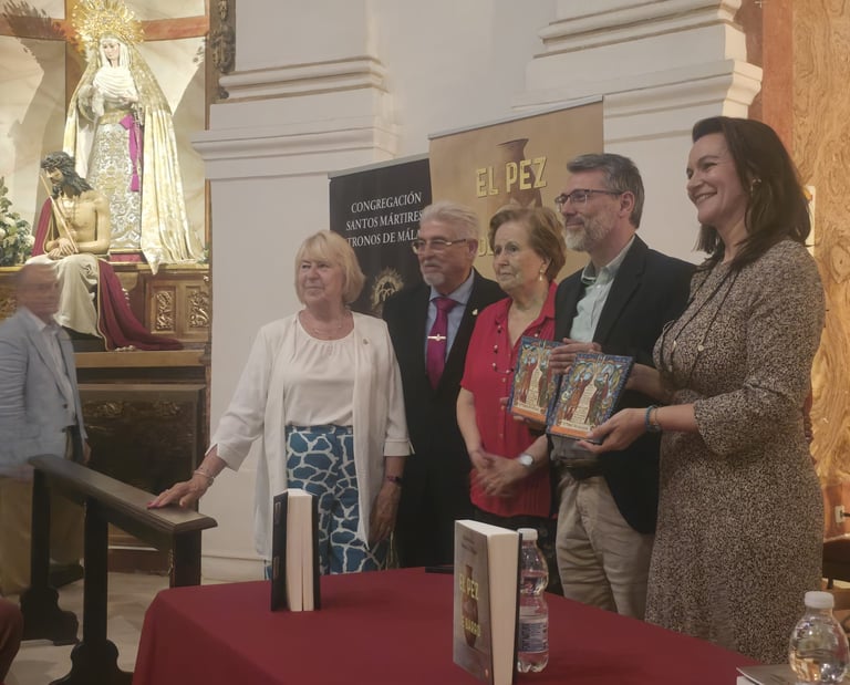 Los autores con las historiadoras Marion Reder y Mari Pepa Lara, principales estudiosas de la devoción a los patronos de Málaga